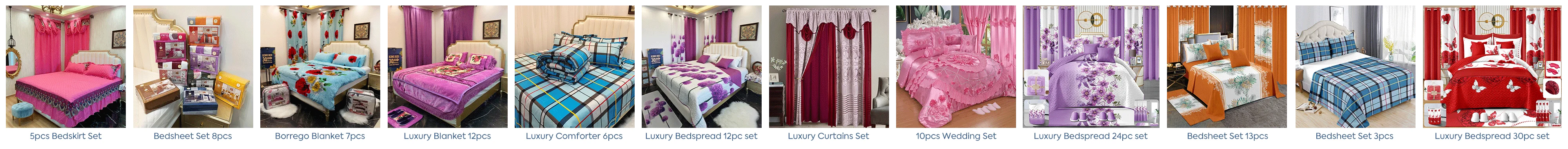 Main categories: Comforter set, Bedding sheet set, Bed spread, Curtains